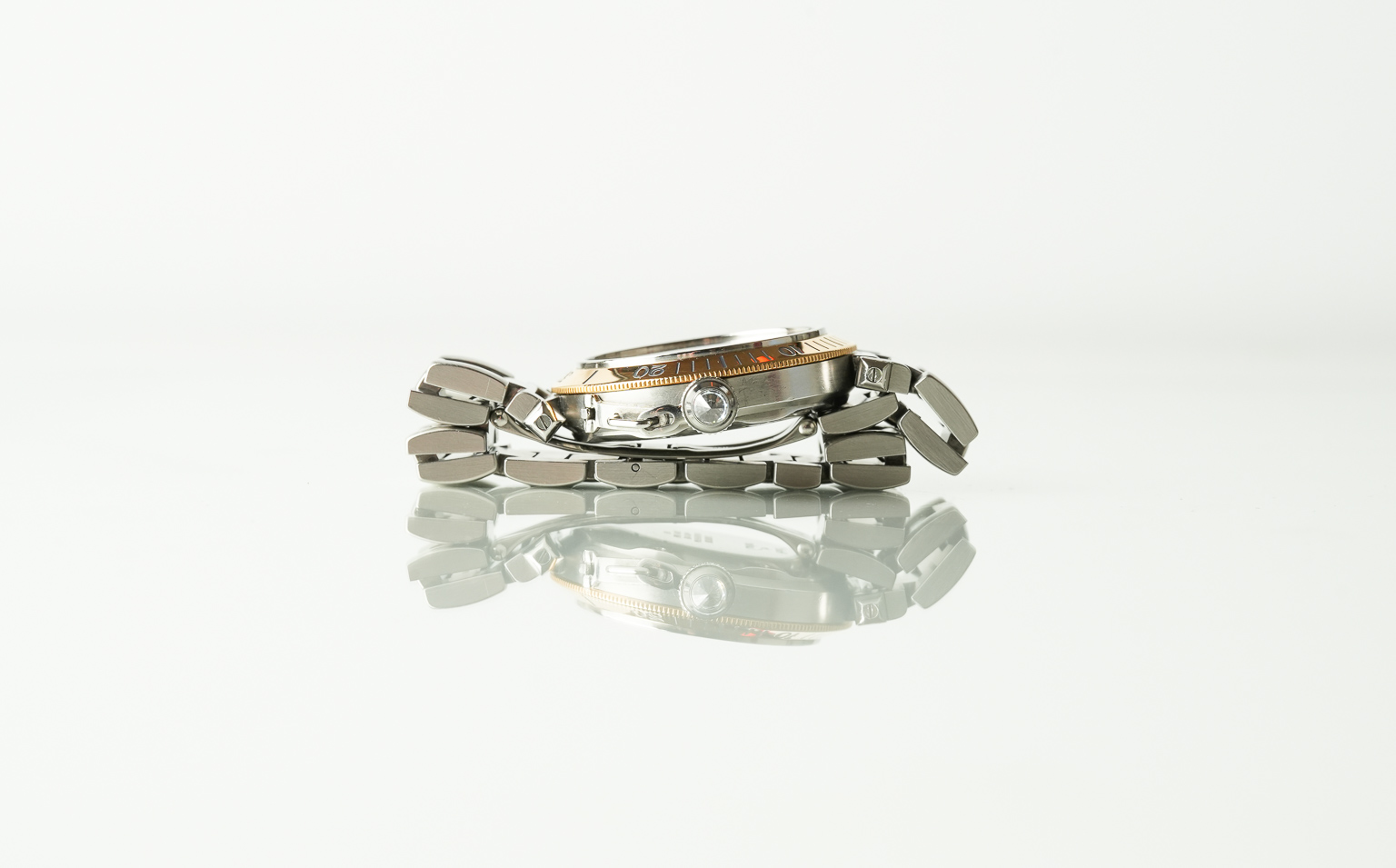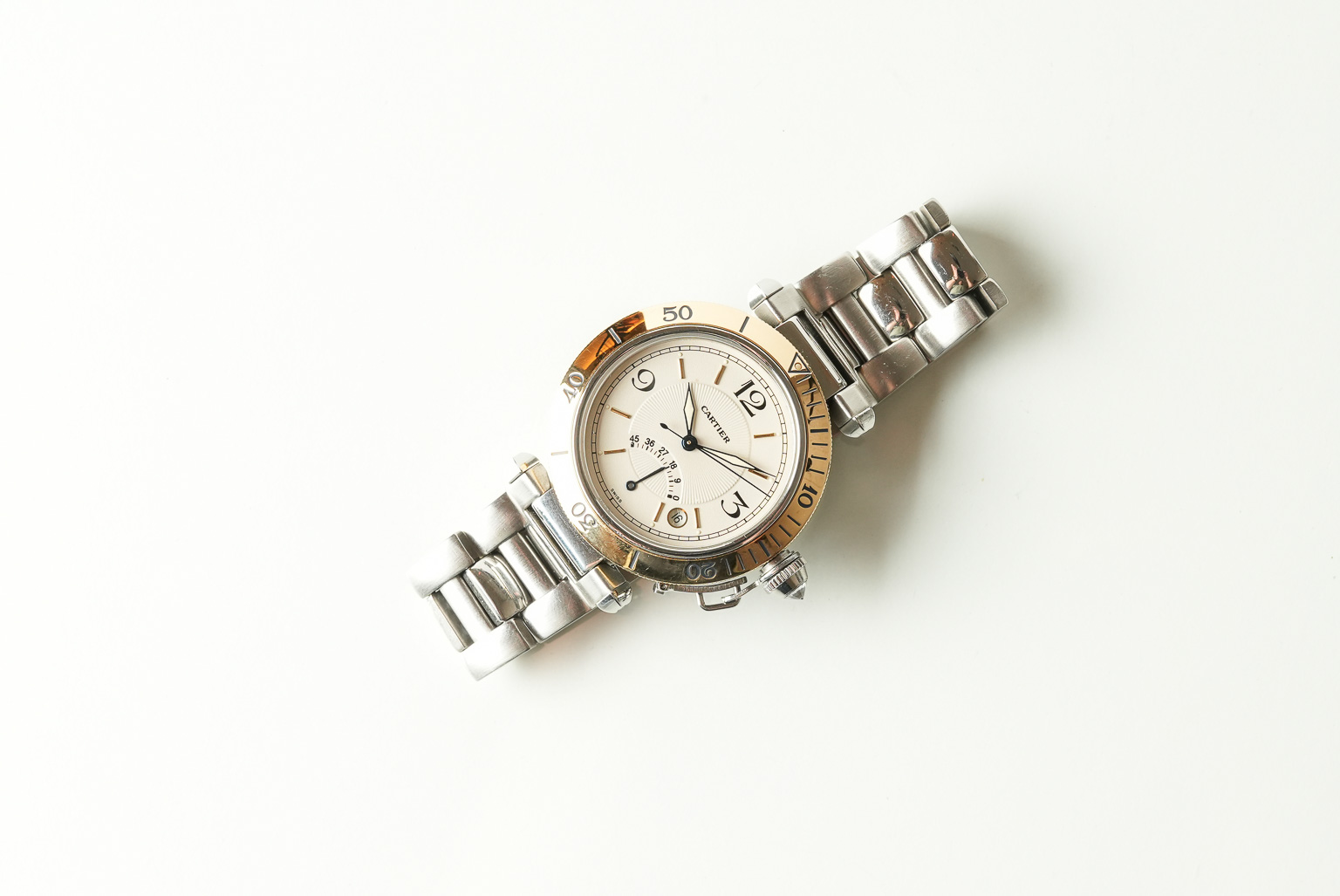 This beautiful two-tone Cartier pasha with power reserve was made in the 1990s and runs on an automatic movement. The gorgeous dial has a creamy white color with a ribbed texture in the center and Cartier style arabic numerals for the 3,9 and 12 hour markers. Furthermore on the dial is a minute track which runs around the dial with polished stick hour markers, a lume dot next to the hour markers and a date function between the 4 and 5 o’clock position which has its own crystal inside the dial. This watch also has a fluted crown cap which protects the crown from damage and a 18k gold bezel. The bracelet on this watch is an integrated bracelet without lugs as the bracelet connects to the 38mm case directly. The condition of this watch is excellent, with some very minor scratches on the caseback.