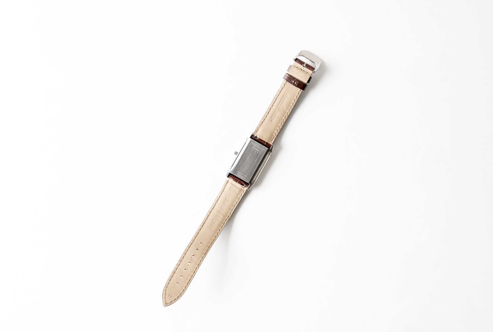 This particular Reverso is a re-release from the 2000s and runs on the reliable quartz movement cal. 608 made by Jaeger-leCoultre. The dial on this watch has a crisp white color with simple yet elegant features. The hour markers are black arabic numerals with the minute track being a deep blue. This watch has blued hands and no seconds hand. The stainless steel case is 22mm wide and 34mm from top to bottom. The condition of this watch is excellent, with some minor scratches on the case.