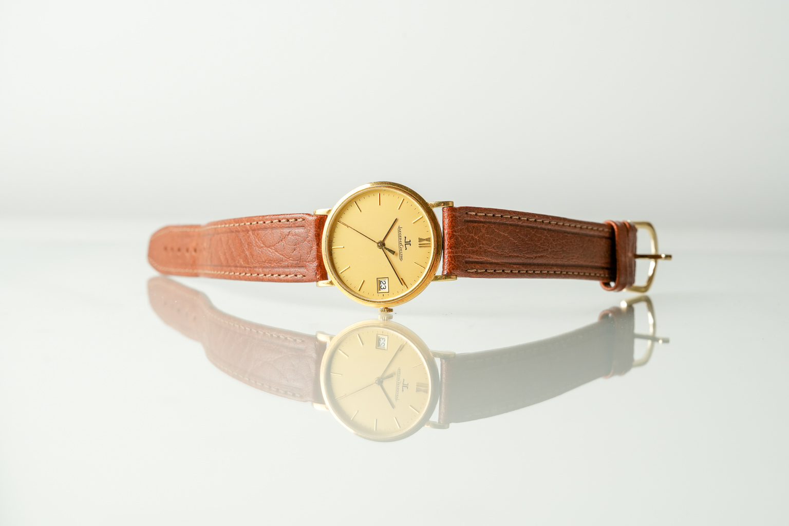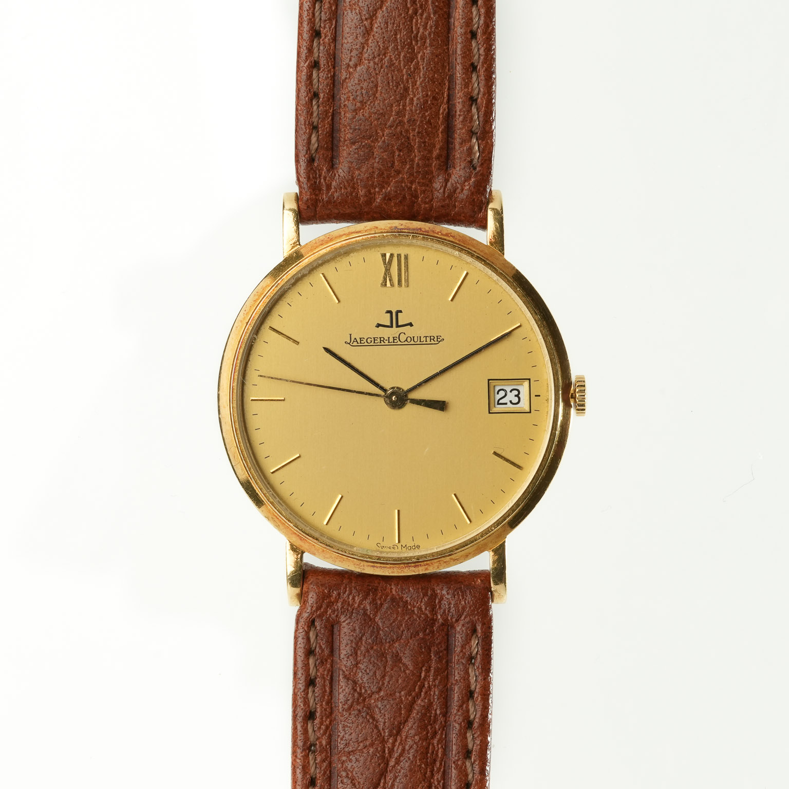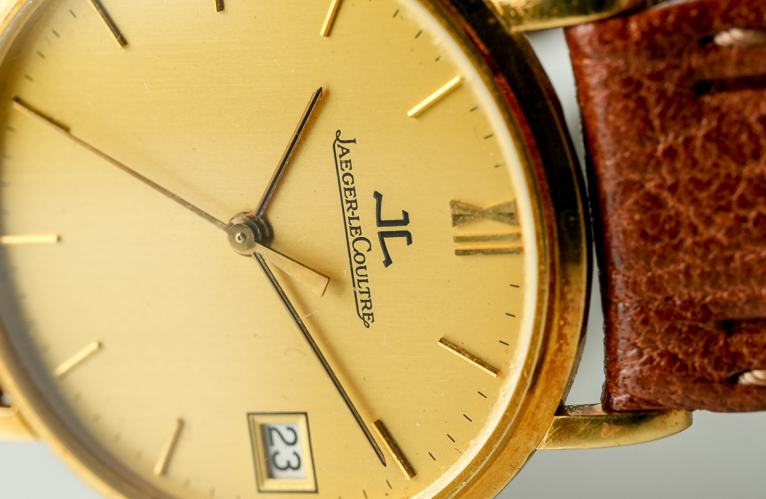 This specific JLC was made in the 1980s and runs on an in-house quartz movement. This great movement is placed inside a 33mm 18k gold case with perfectly shaped lugs. The dial on this watch is very delicate, with a champagne color, very thin 18k gold hands and hour markers. This watch comes with a brown leather strap which has a 18k gold buckle in good shape. The overall condition of this watch is near mint, with the 18k gold case being in very good shape with some very minor scratches.