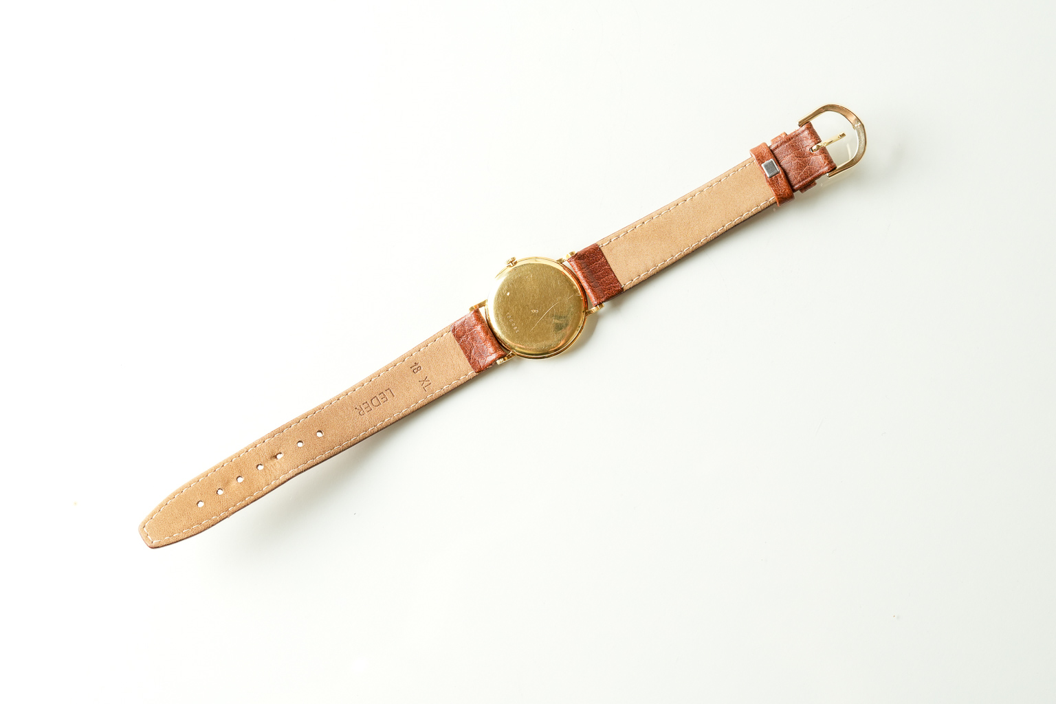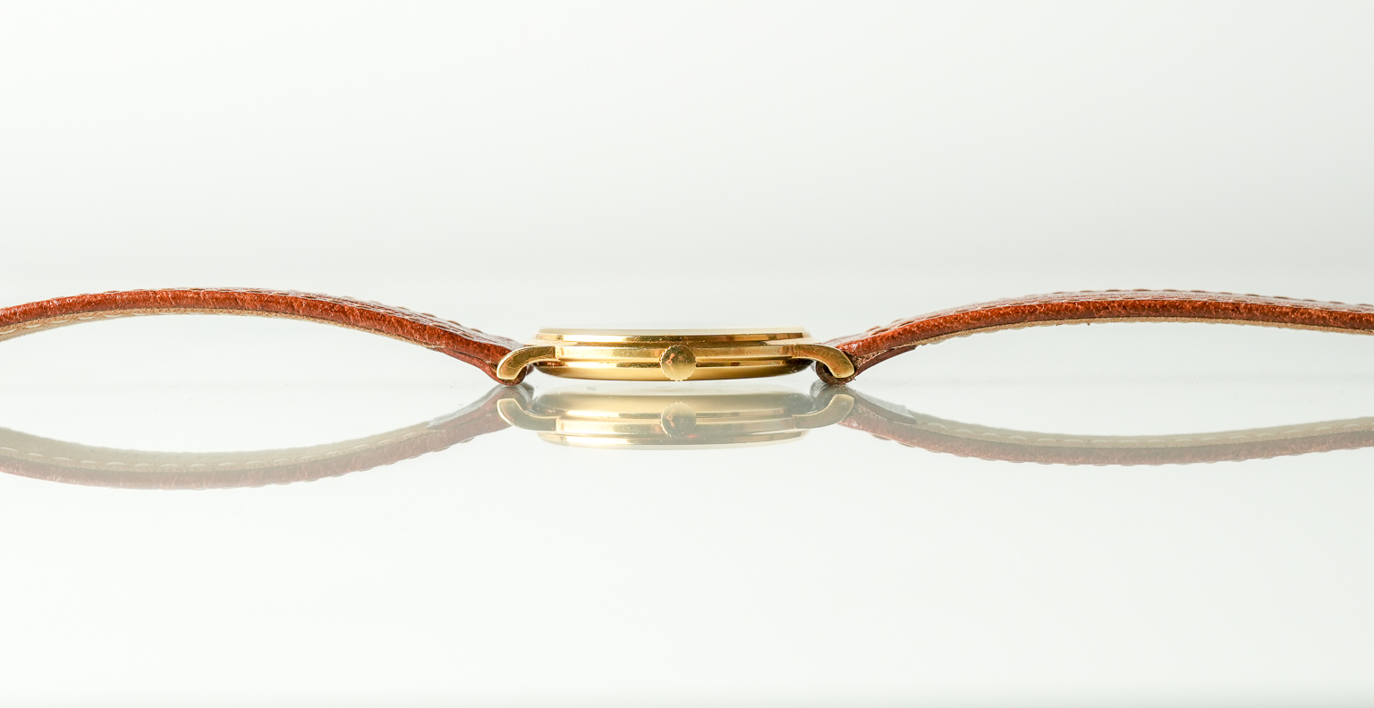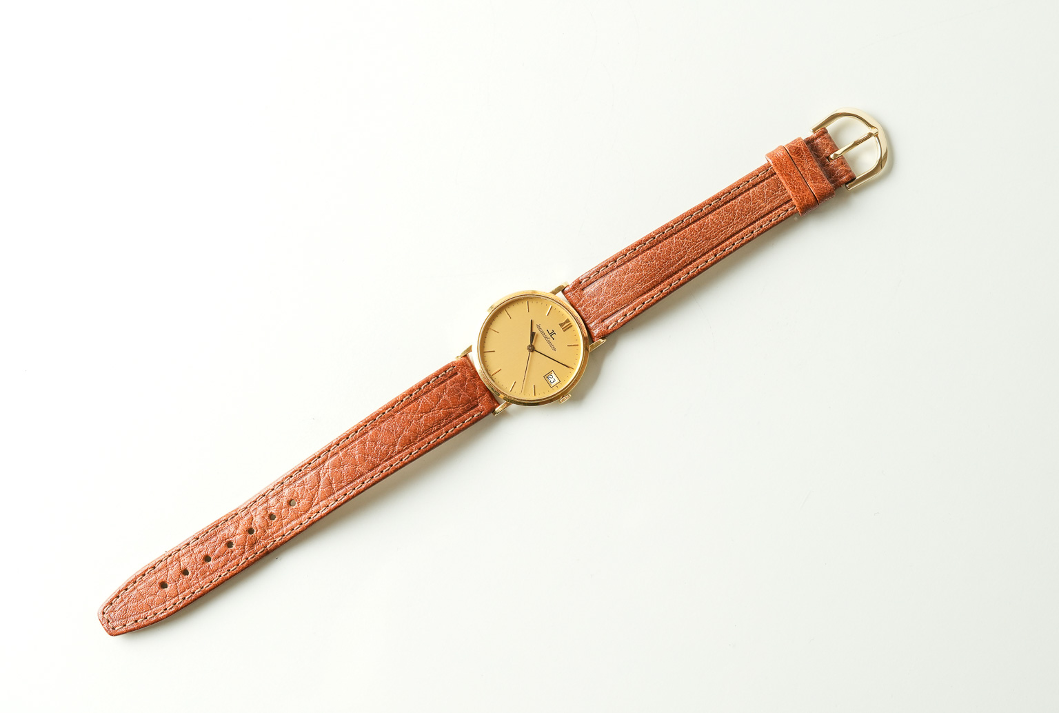 This specific JLC was made in the 1980s and runs on an in-house quartz movement. This great movement is placed inside a 33mm 18k gold case with perfectly shaped lugs. The dial on this watch is very delicate, with a champagne color, very thin 18k gold hands and hour markers. This watch comes with a brown leather strap which has a 18k gold buckle in good shape. The overall condition of this watch is near mint, with the 18k gold case being in very good shape with some very minor scratches.