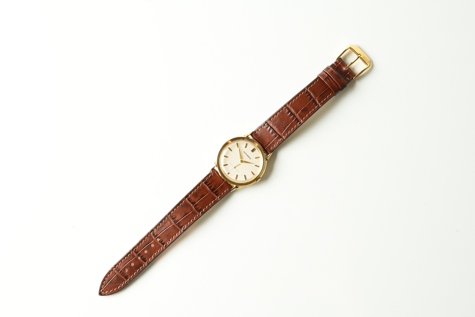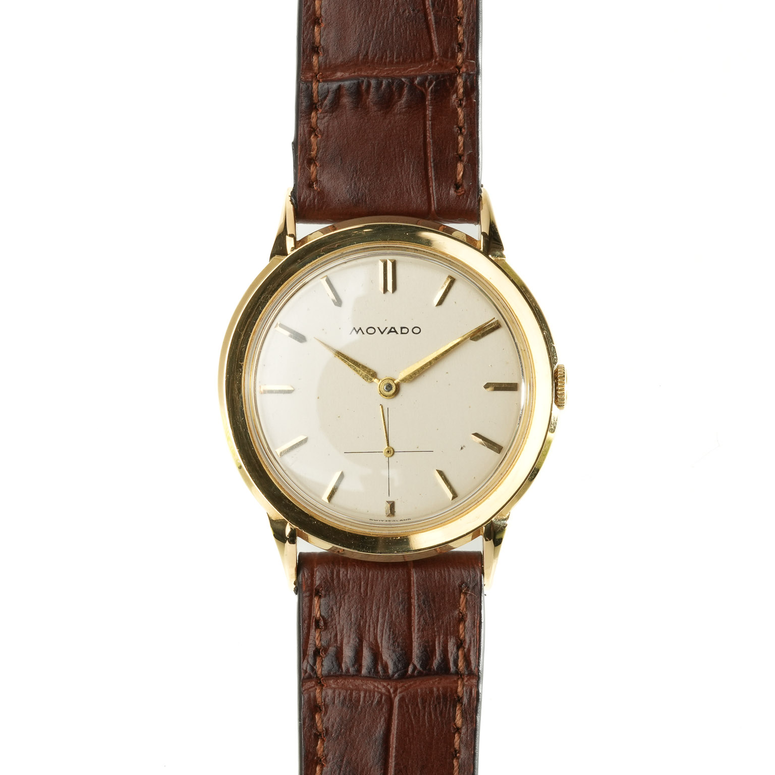 This 18 carat gold dress watch is as classy as they come. Featuring applied golden indices and gorgeous lance hands, the elegant look of the case and fancy lugs is continued on the slightly patina-ed dial. The finishing touch is the petite seconde complication, where a golden second hand glides over a crosshair motif at the 6-hour position. The driving force behind these hands is a 15 jewel Movado cal. 8612 hand wound time-only movement.