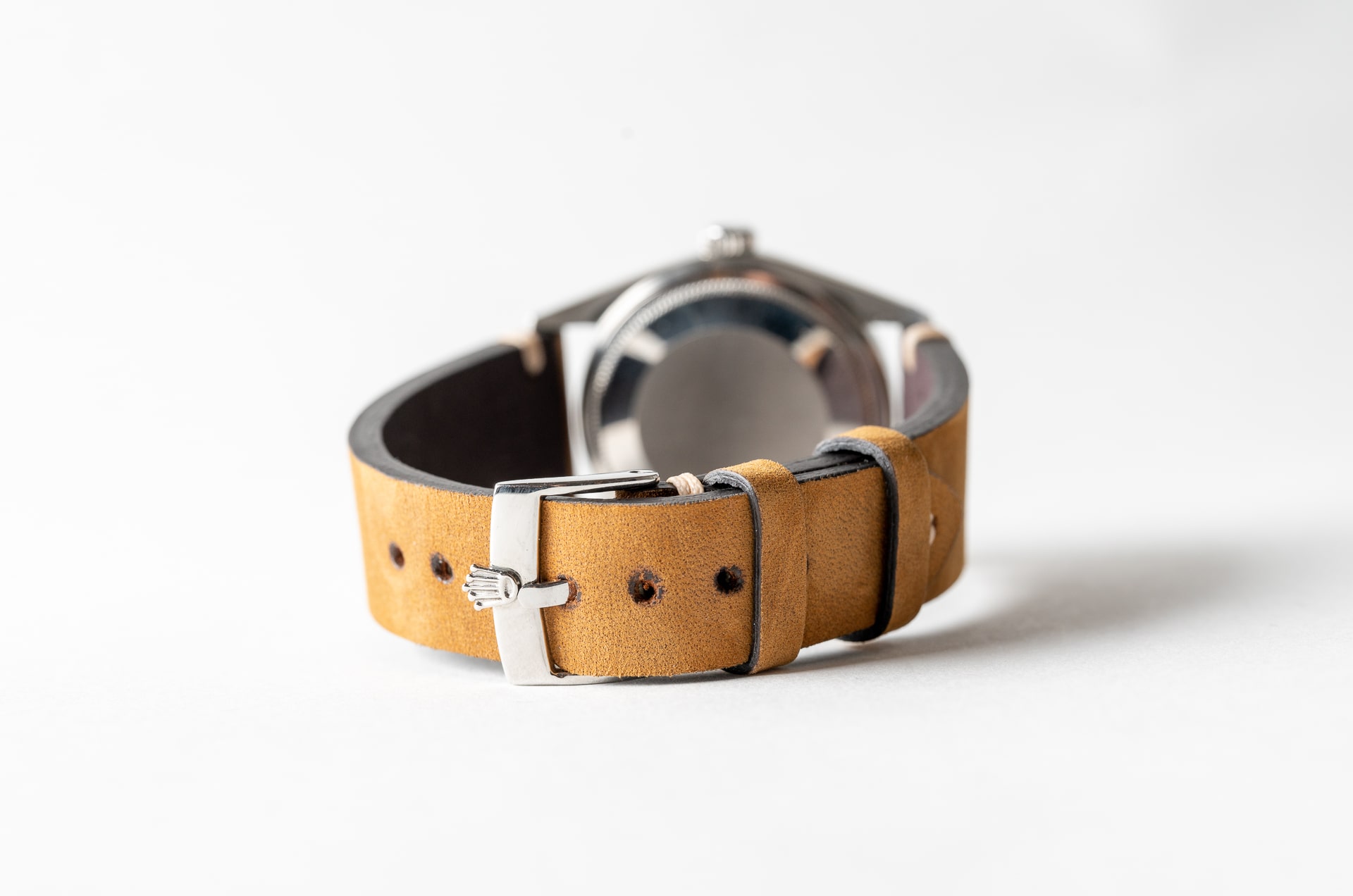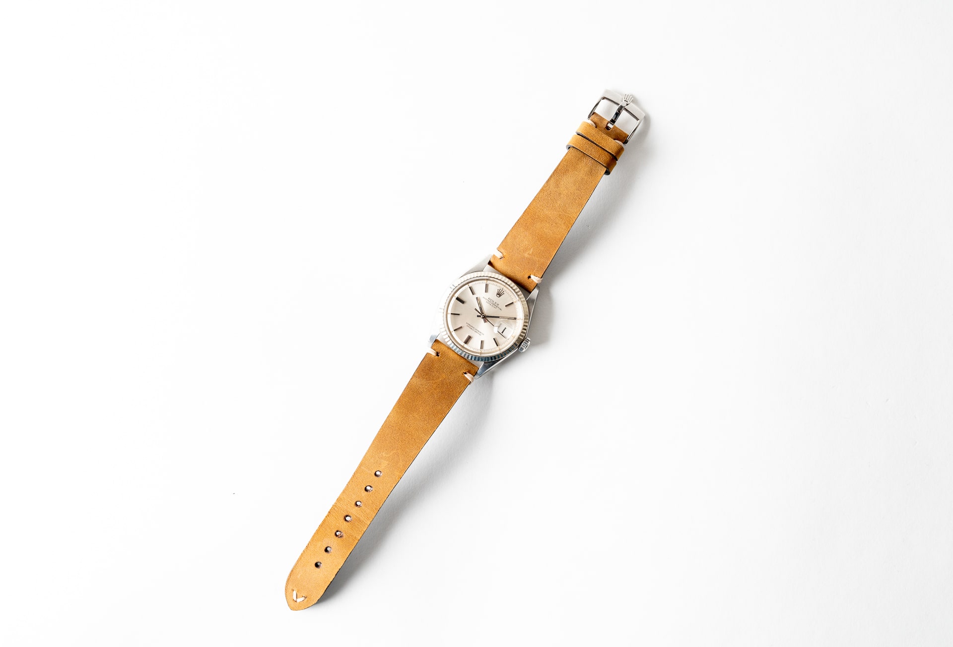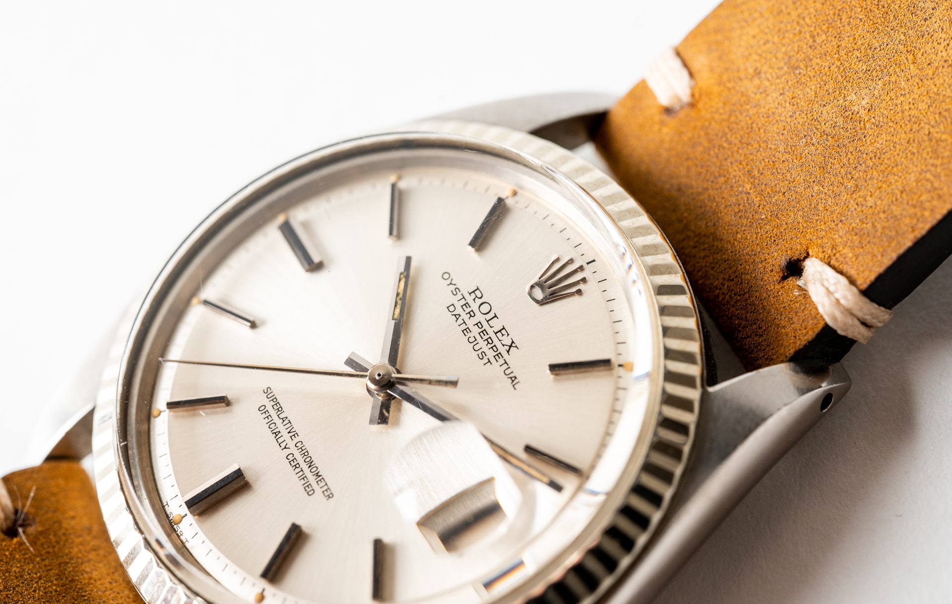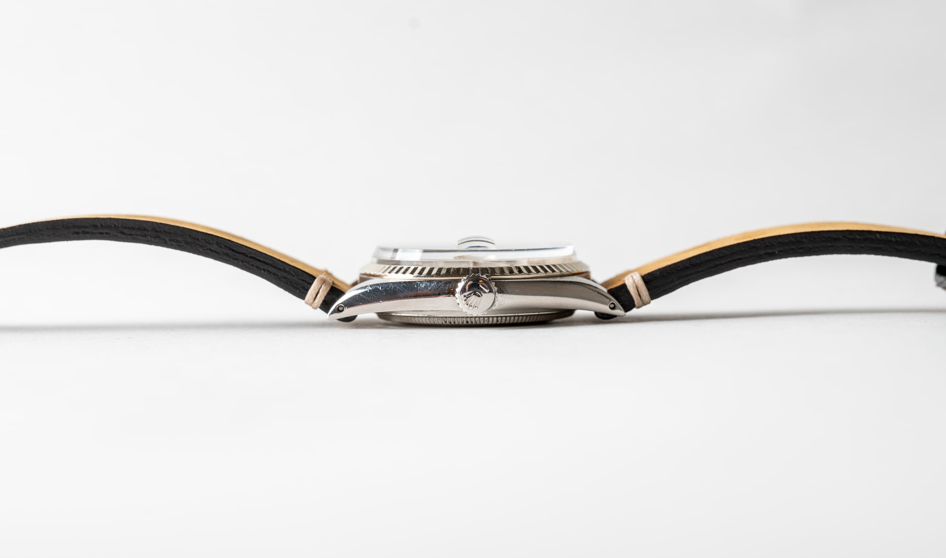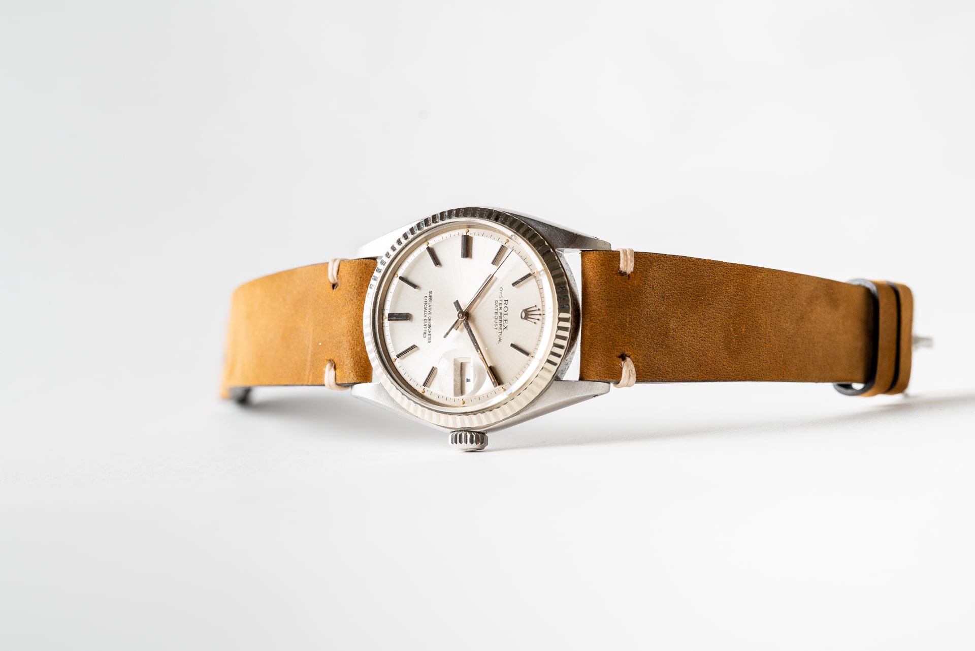 This Rolex datejust was made in 1970 and runs on the famous and sturdy 1575 automatic movement made in-house by Rolex. This 36mm stainless steel oyster case features a white gold fluted bezel, a screw down crown and a screwdown caseback we are used to seeing on oyster cases. Inside the case sits a gorgeous pie pan silver dial with beautifully aged lume plots. The dial also features applied stick markers and of course the famous Rolex crown. This watch comes on a brown leather strap with an original Rolex buckle. The condition of this watch is near mint, with some very light polishing and a small mark on the caseback.